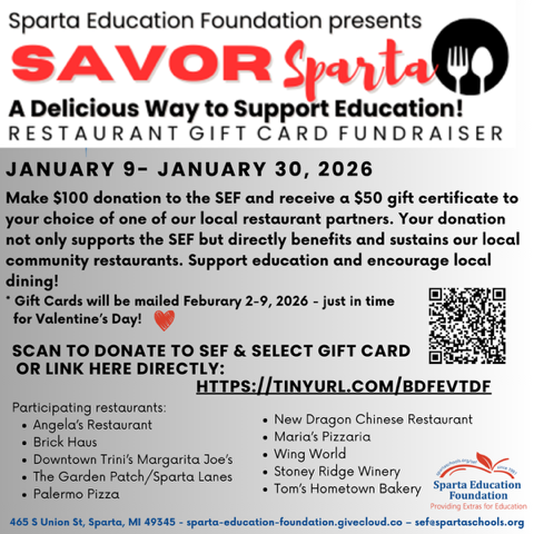 Donate $100 to SEF January 9-30, 2026, and receive a $50 gift certificate to the participating restaurant of your choice. Gift cards will be mailed February 2-9, 2026. Complete the form at this link: